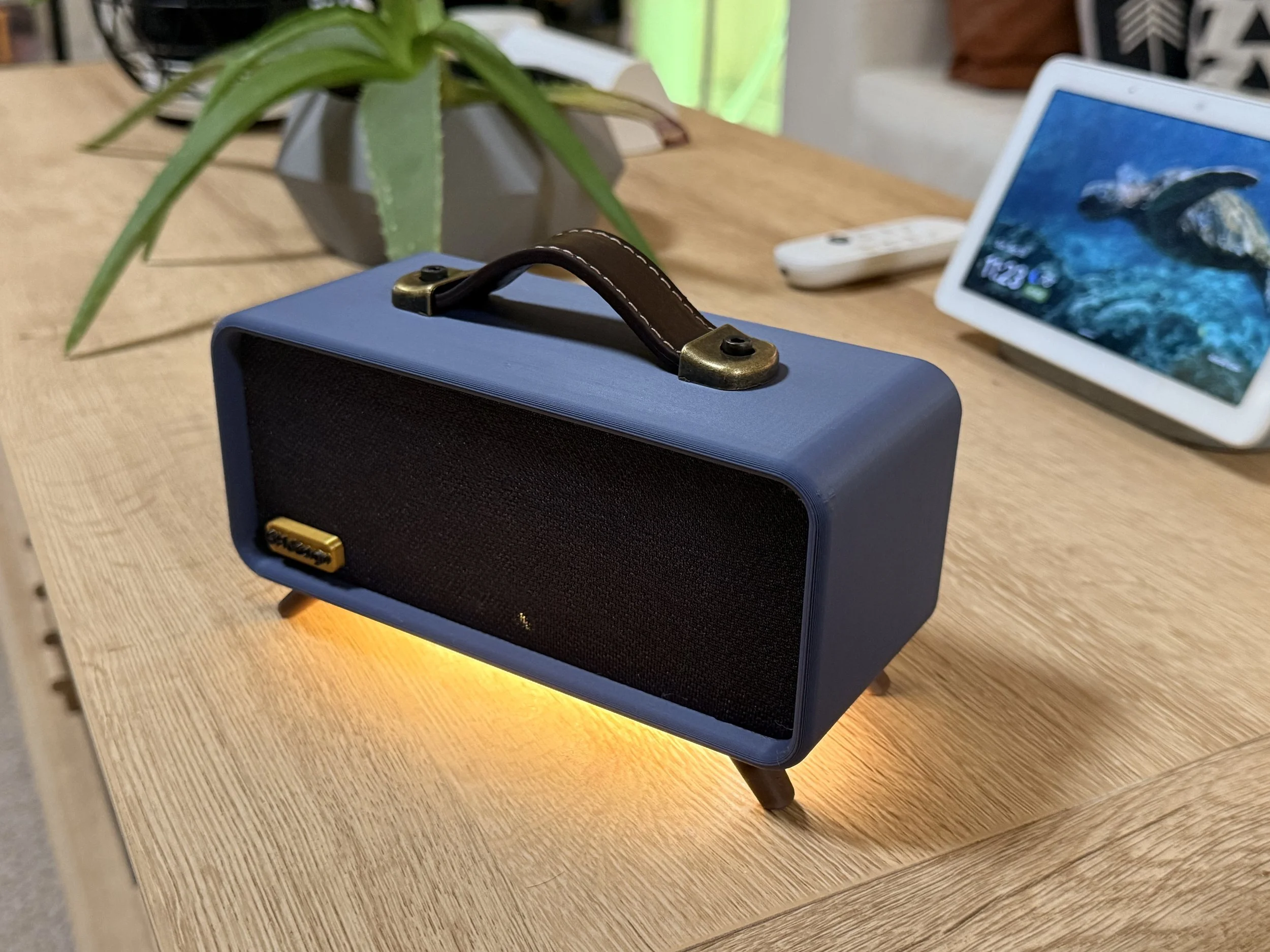 Compact speaker with built-in under-lighting. Walnut panel + recycled grille cloth. Clean geometry, hidden controls.