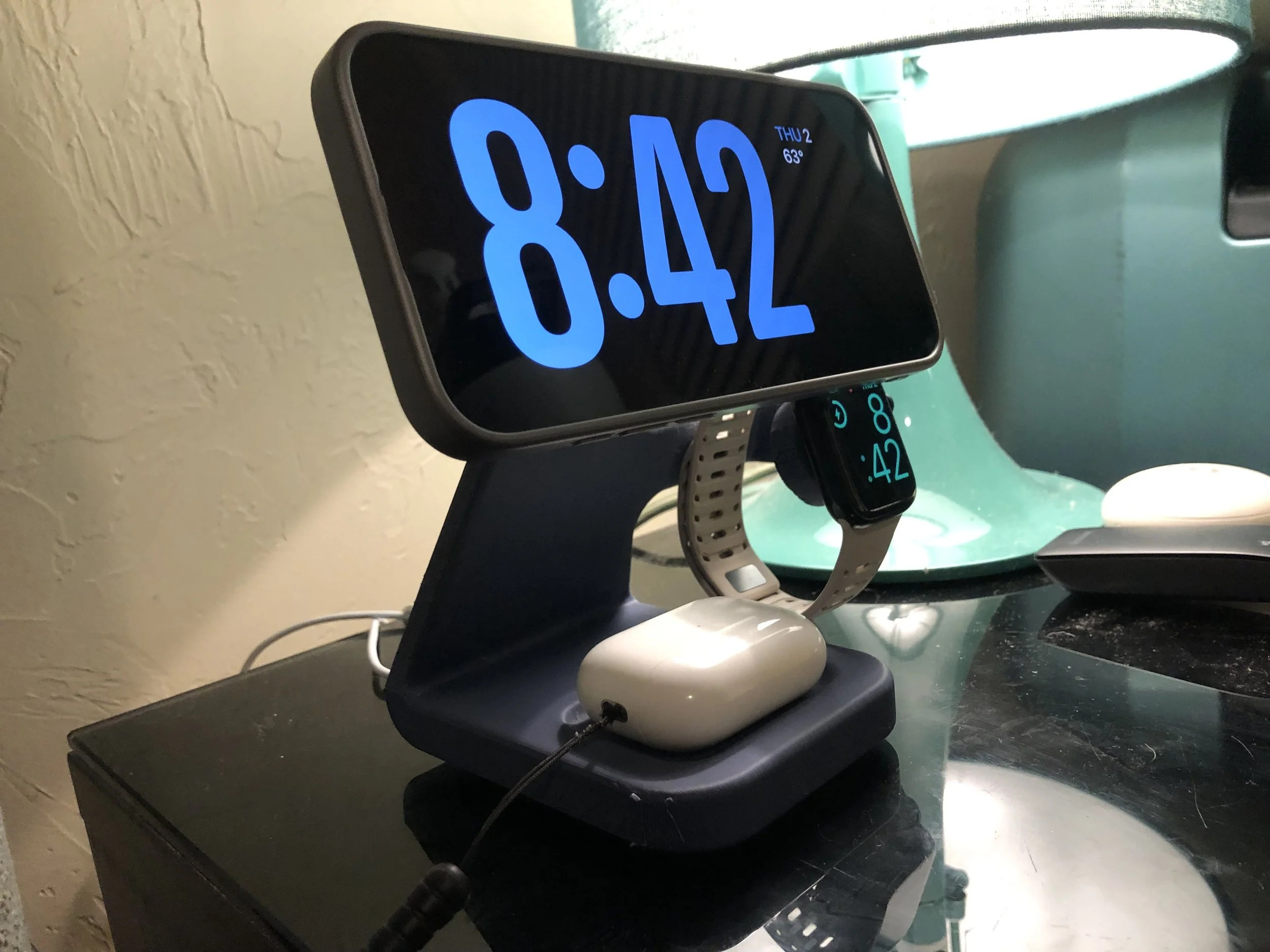 MagSafe dock for iPhone and AirPods. Unified power core with a minimal footprint. Keeps devices upright, organized, and easy to access on a desk or nightstand