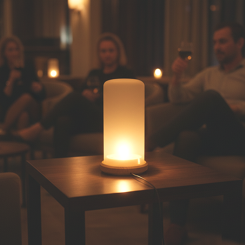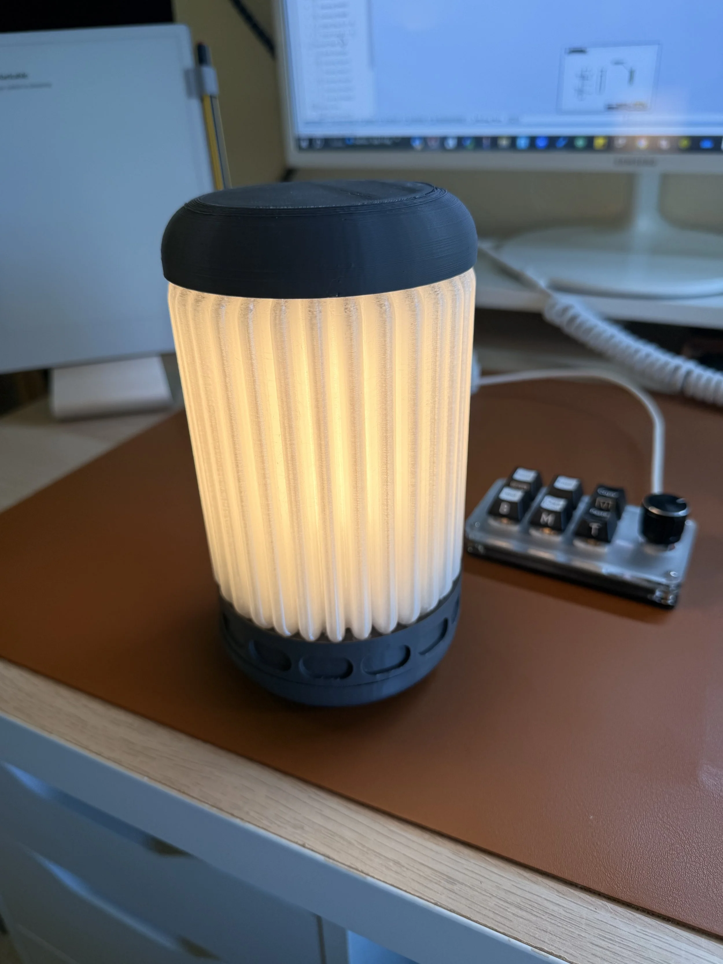 Small LED accent lamp combining wood, 3D-printed components, and diffused light. Designed to add a soft glow without dominating the room.