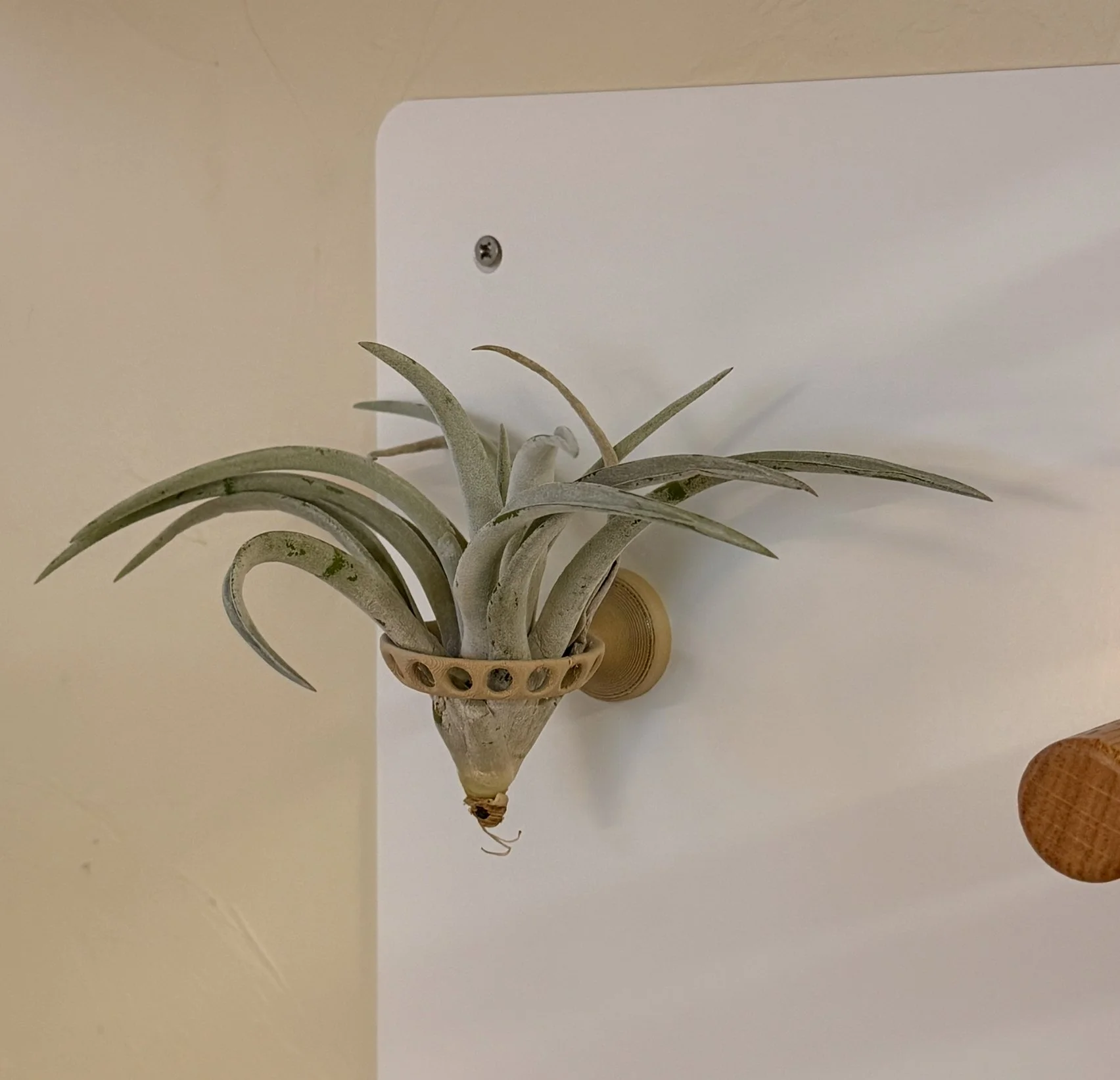 Magnetic wall planter for air-plants. Wood + steel + strong embedded magnets. Functional object, subtle presence.
